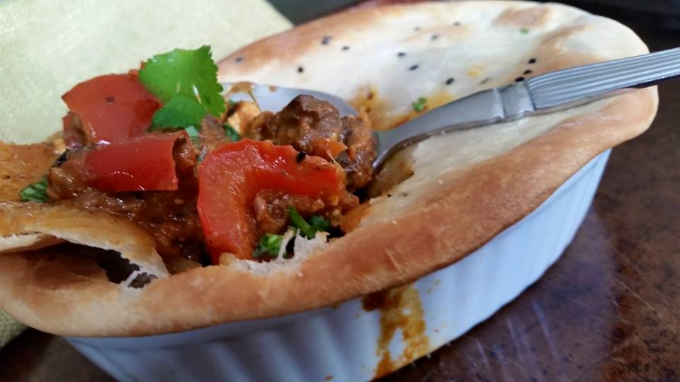 Well, I have been thinking of making potpie for a while now. I came up with an Indian version of a mini potpie. The filling is mix vegetables and paneer tikka masala and the crust is made from naan dough.
